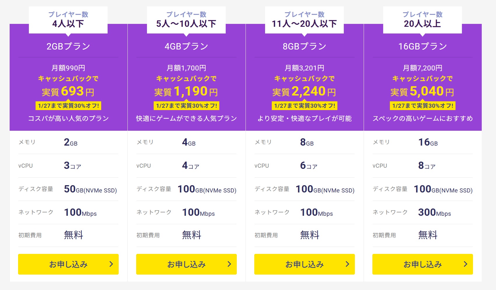VPSを申し込む際は、上記に対応しているプランを選べばOKです。4GBプラン以上でマイクラプラグインサーバーを快適に遊べます。